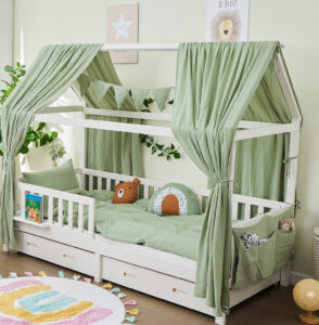 Hausbett Dekoset mit Wimpelkette aus Bio-Musselin-Baumwolle in vielen Farben