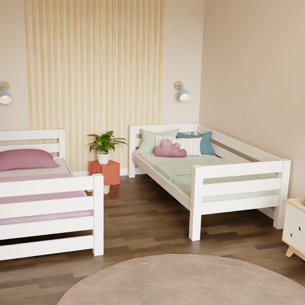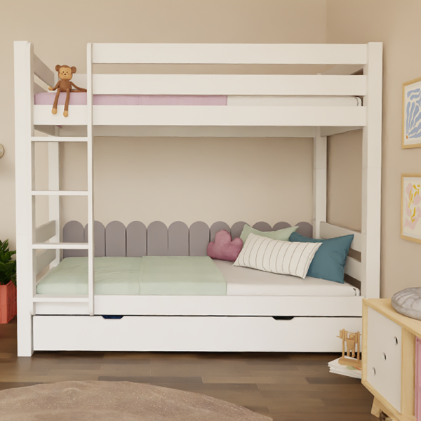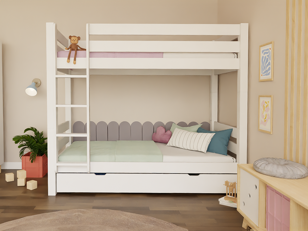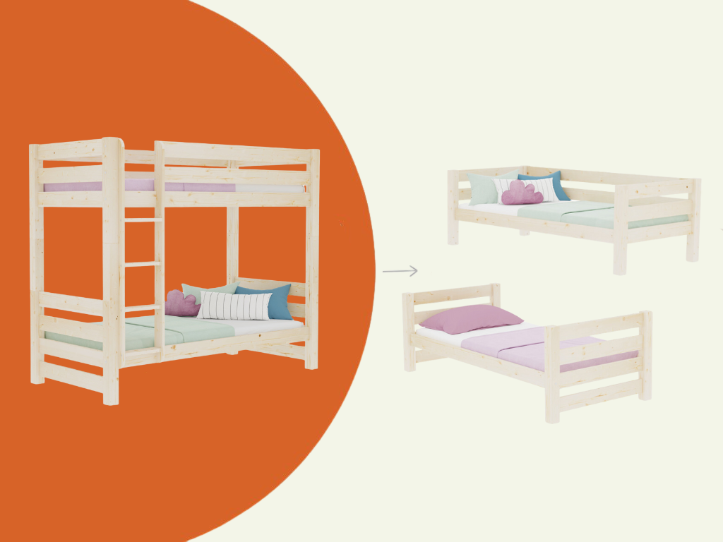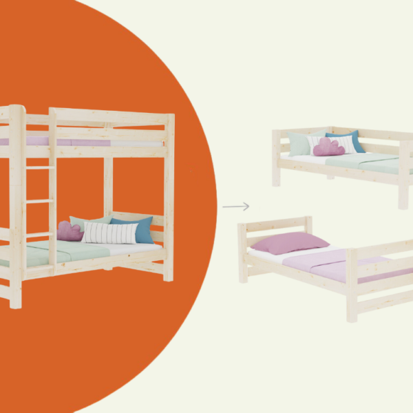 Spare wertvollen Platz im Kinderzimmer mit unserem robusten Etagenbett ATLAS. Der komplette Rahmen besteht aus massivem Kiefernholz und wurde speziell für Kinder entwickelt. Zudem lässt sich das Bett bei Bedarf zu zwei einzelnen Betten umbauen – ideal für wachsende Familien oder wechselnde Schlafsituationen.