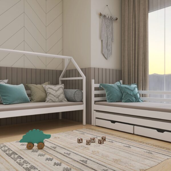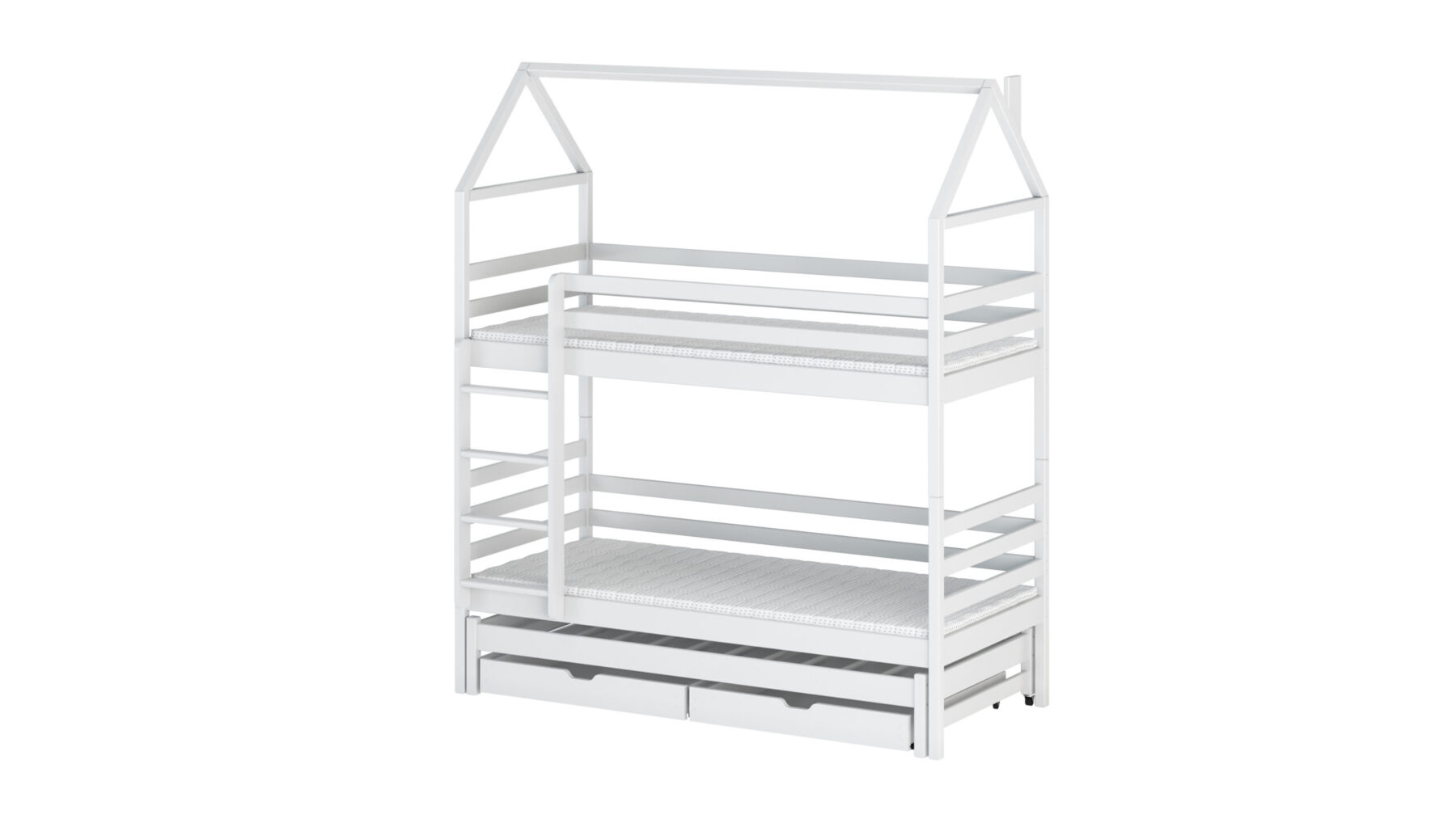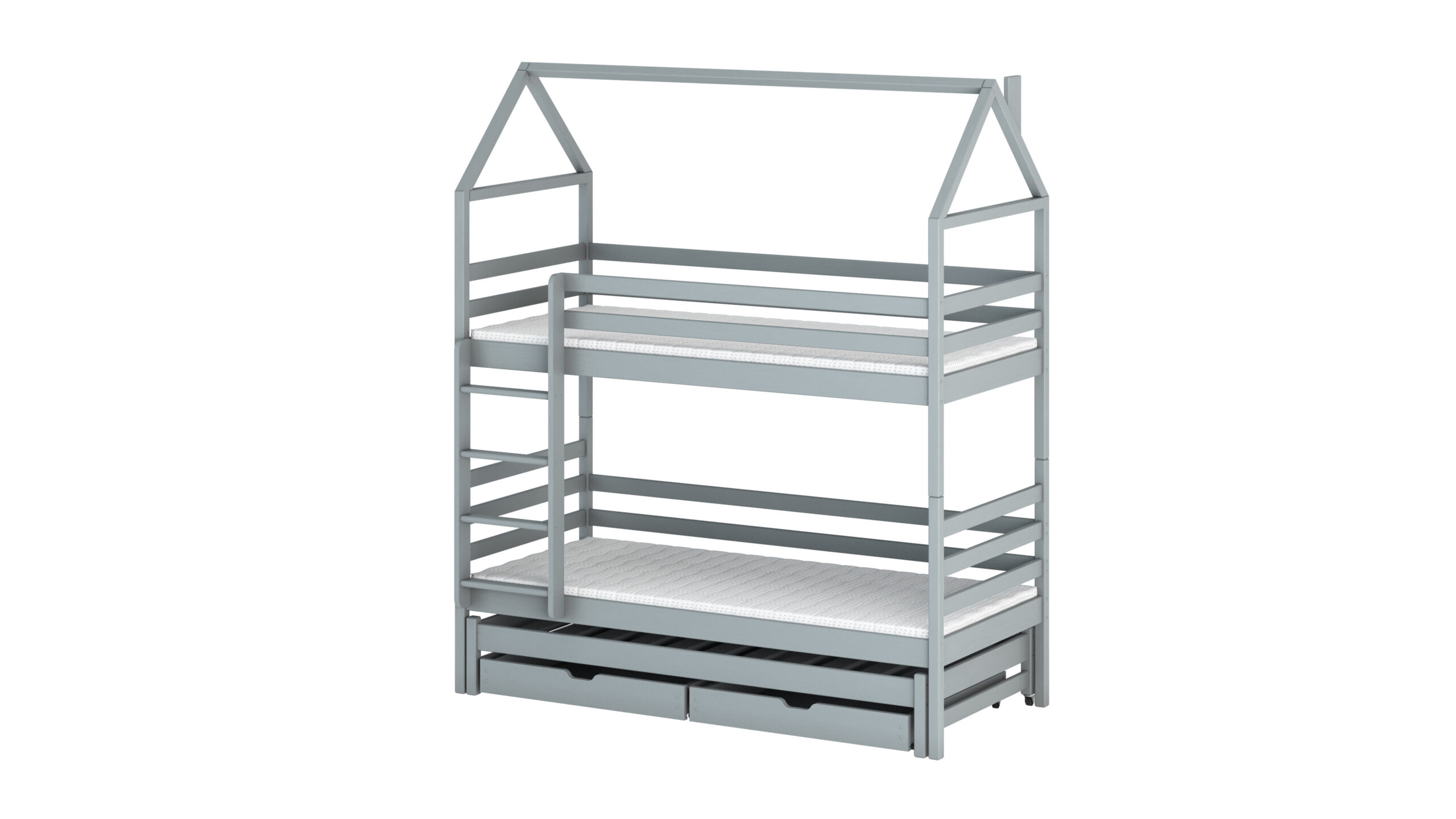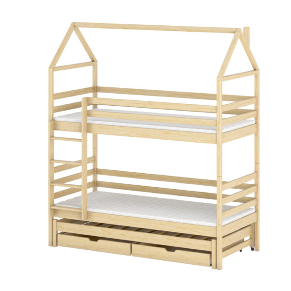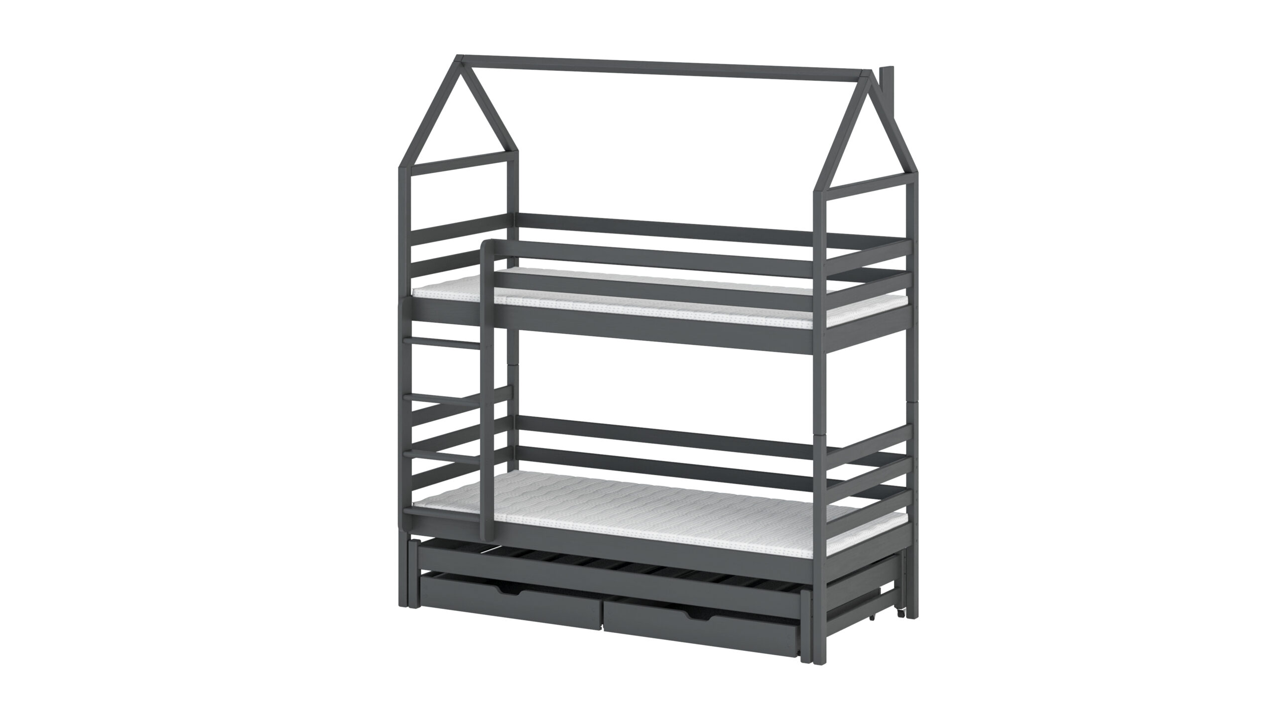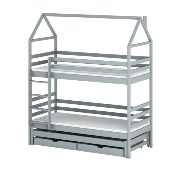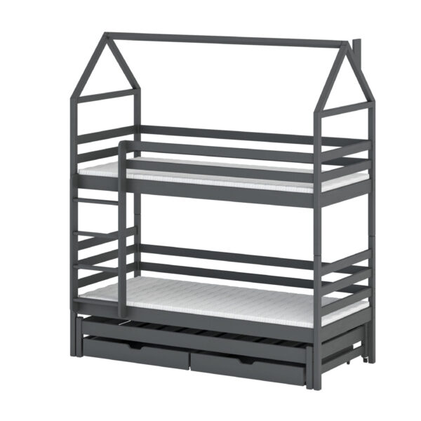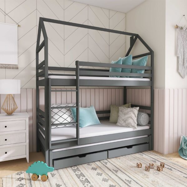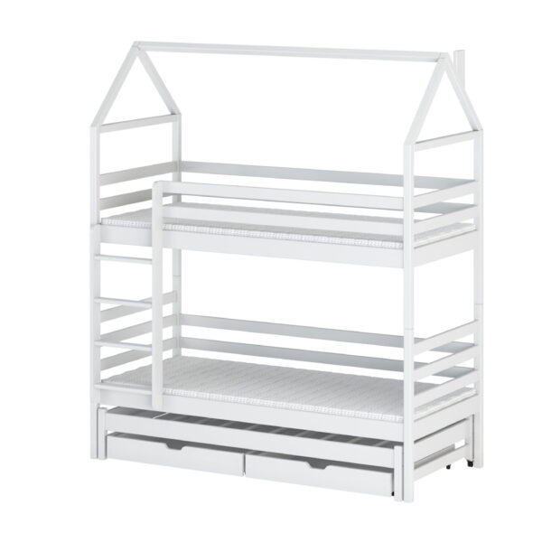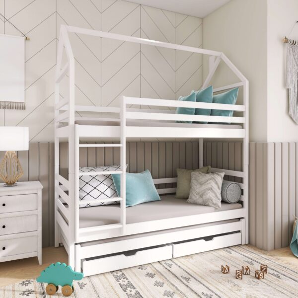 - Etagenbett in Hausbett Design mit zusätzlichem Gästebett und 2 Schubladen für mehr Stauraum