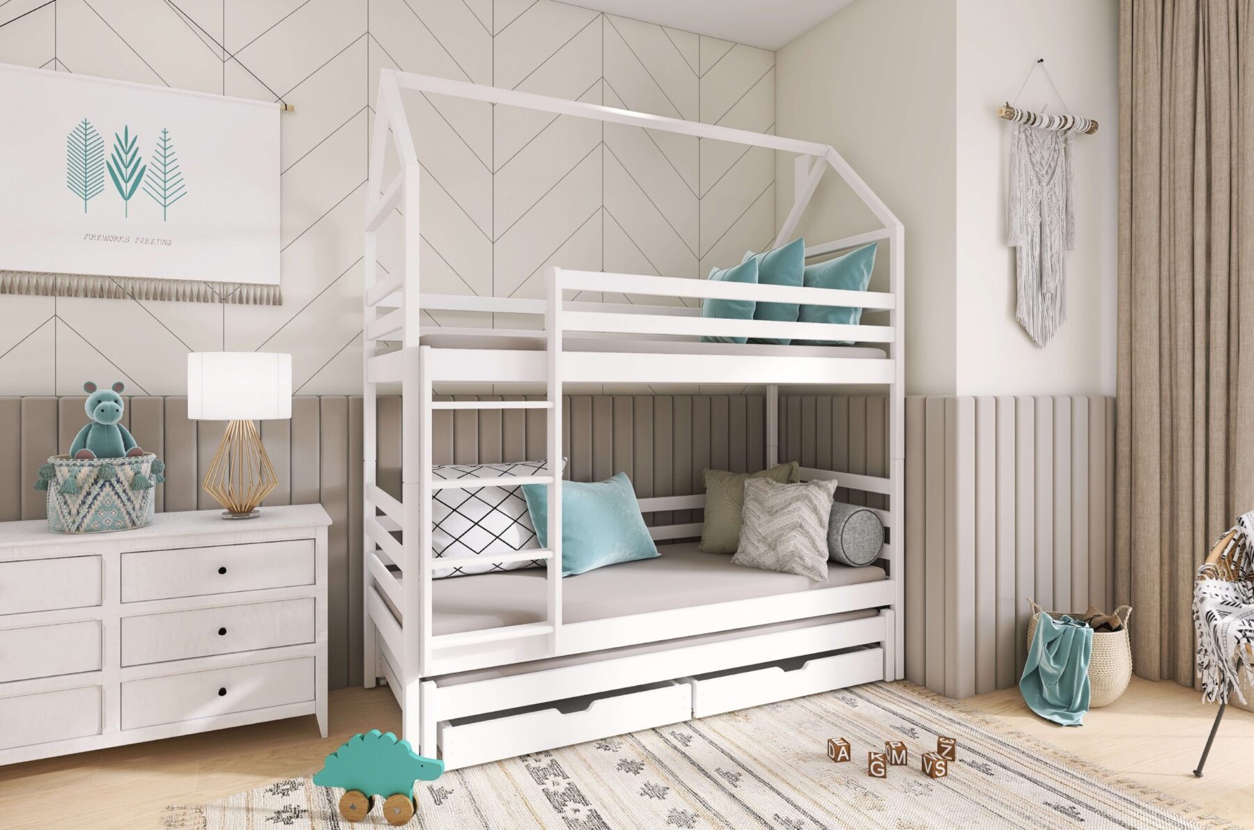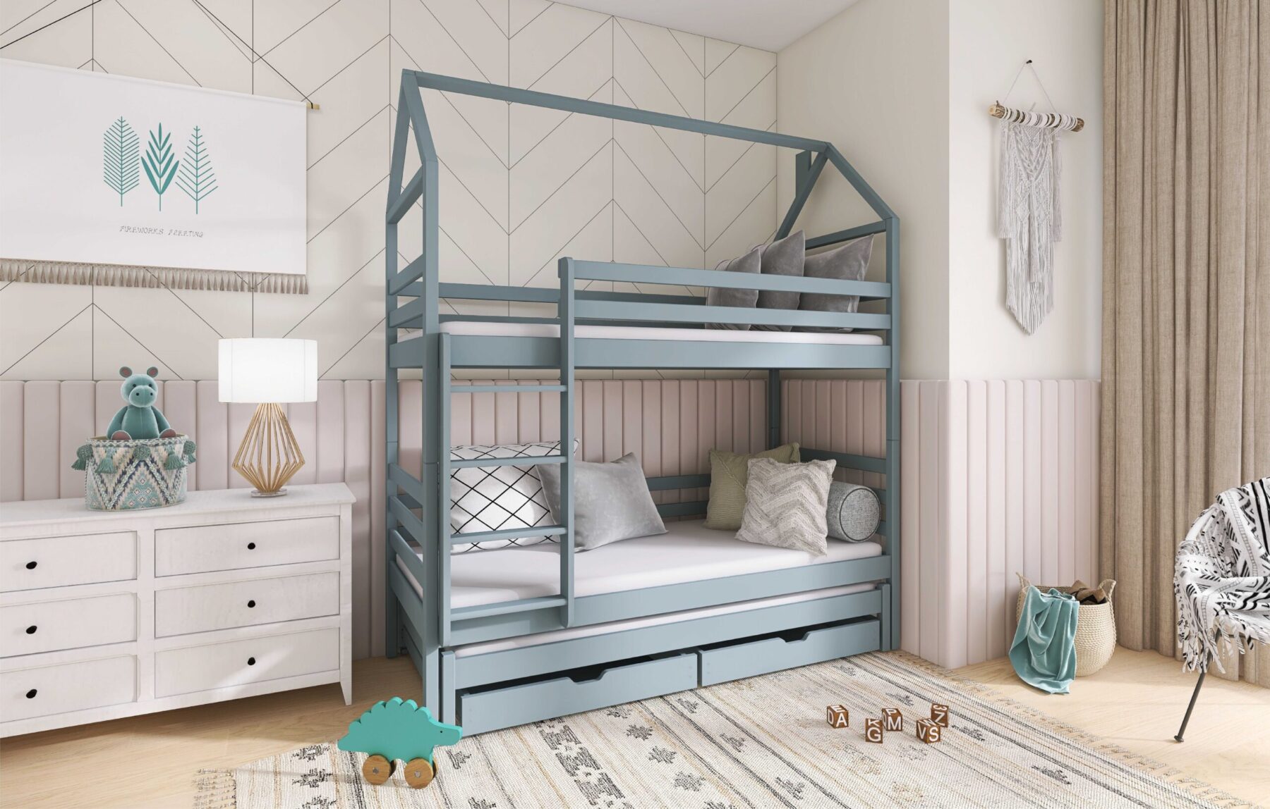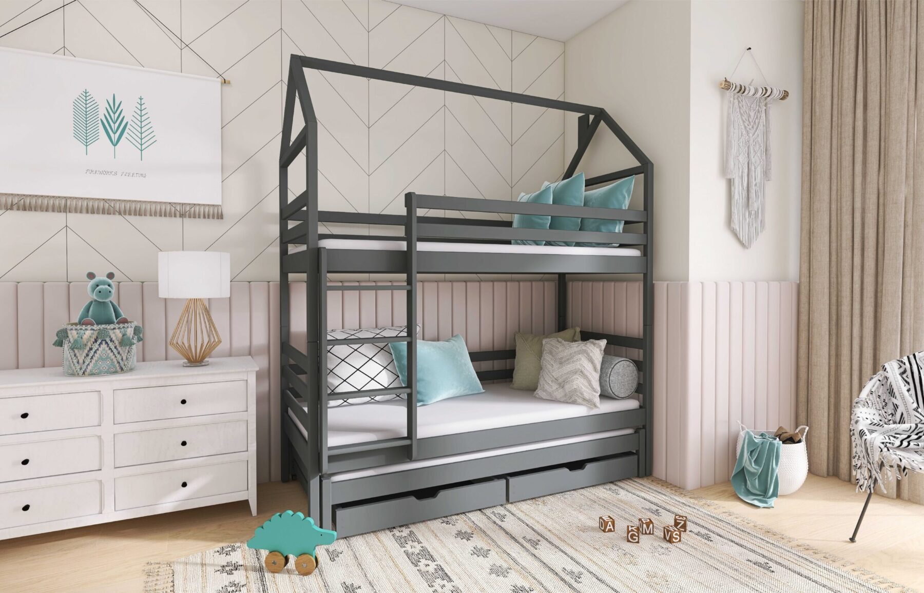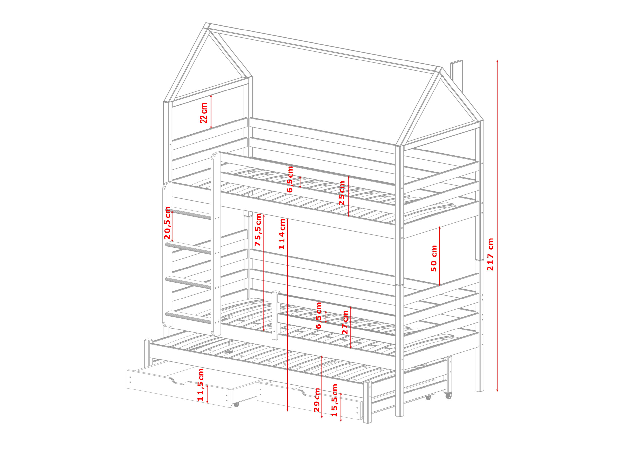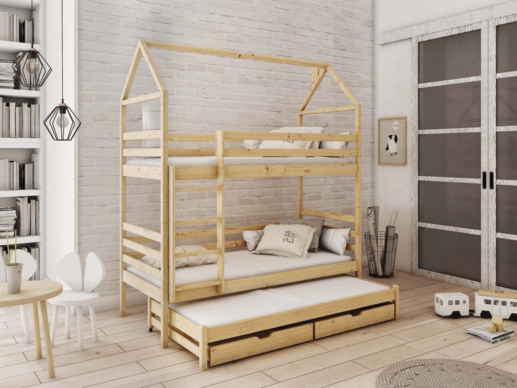 - Etagenbett in Hausbett Design mit zusätzlichem Gästebett und 2 Schubladen für mehr Stauraum