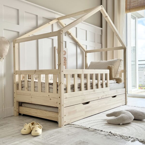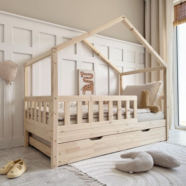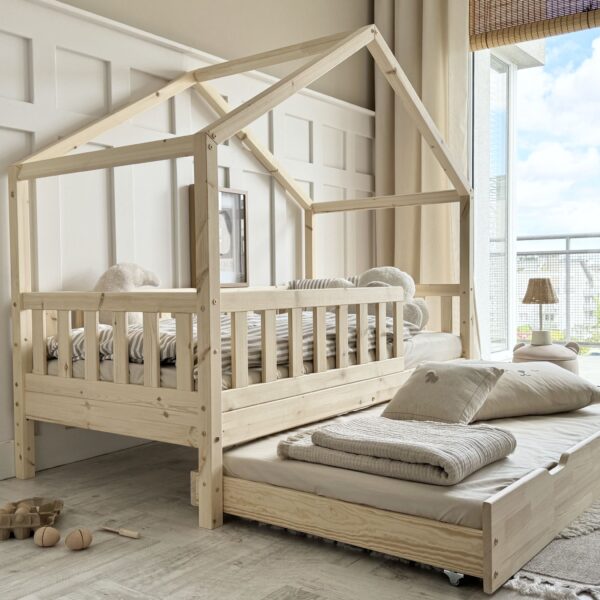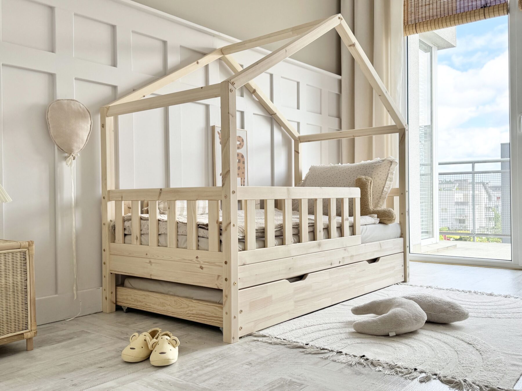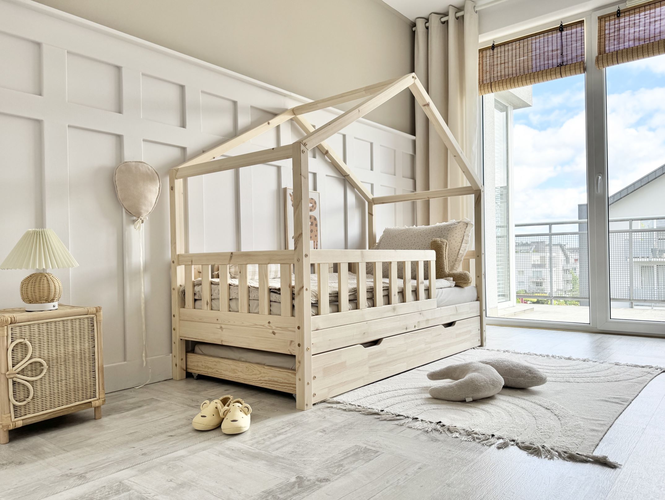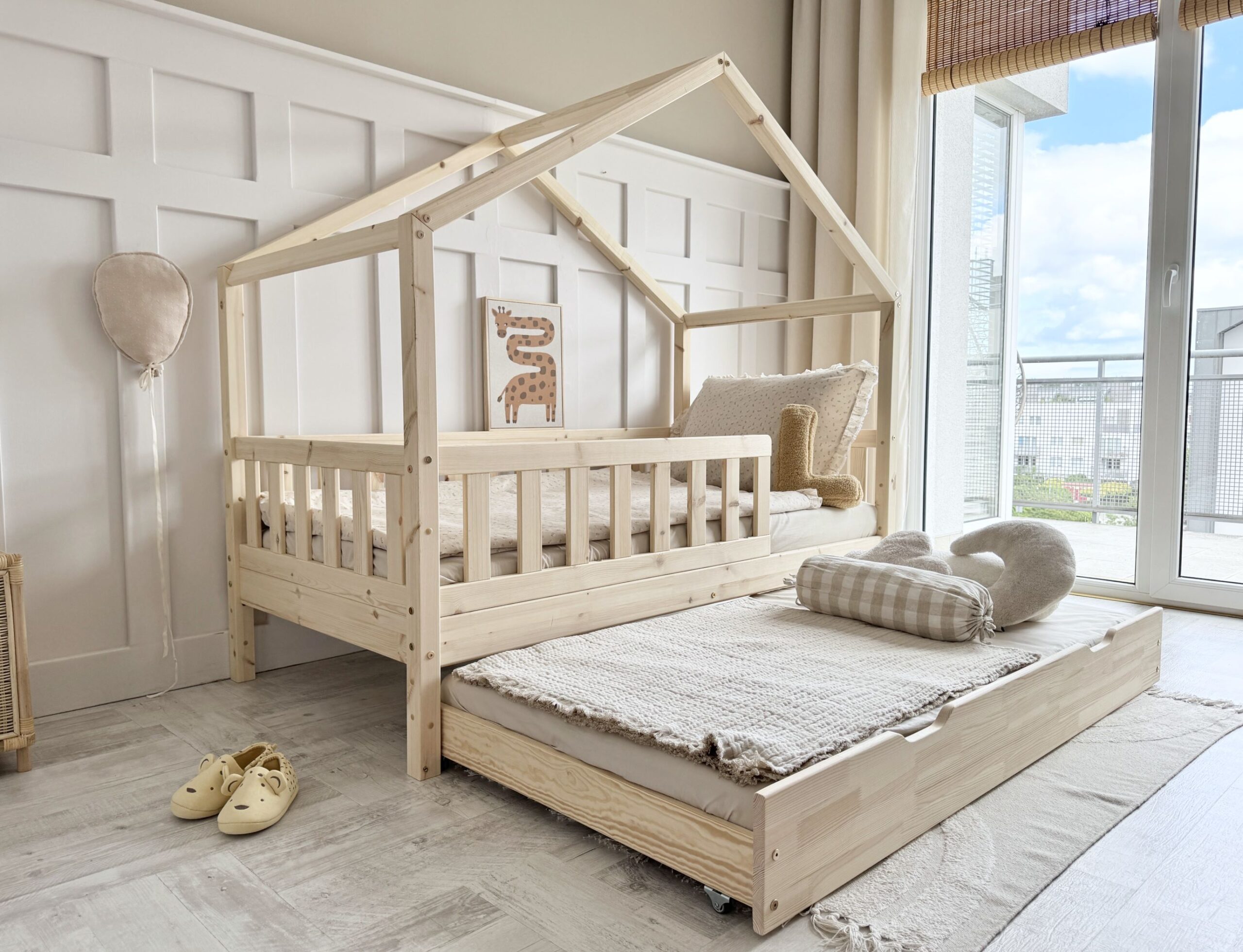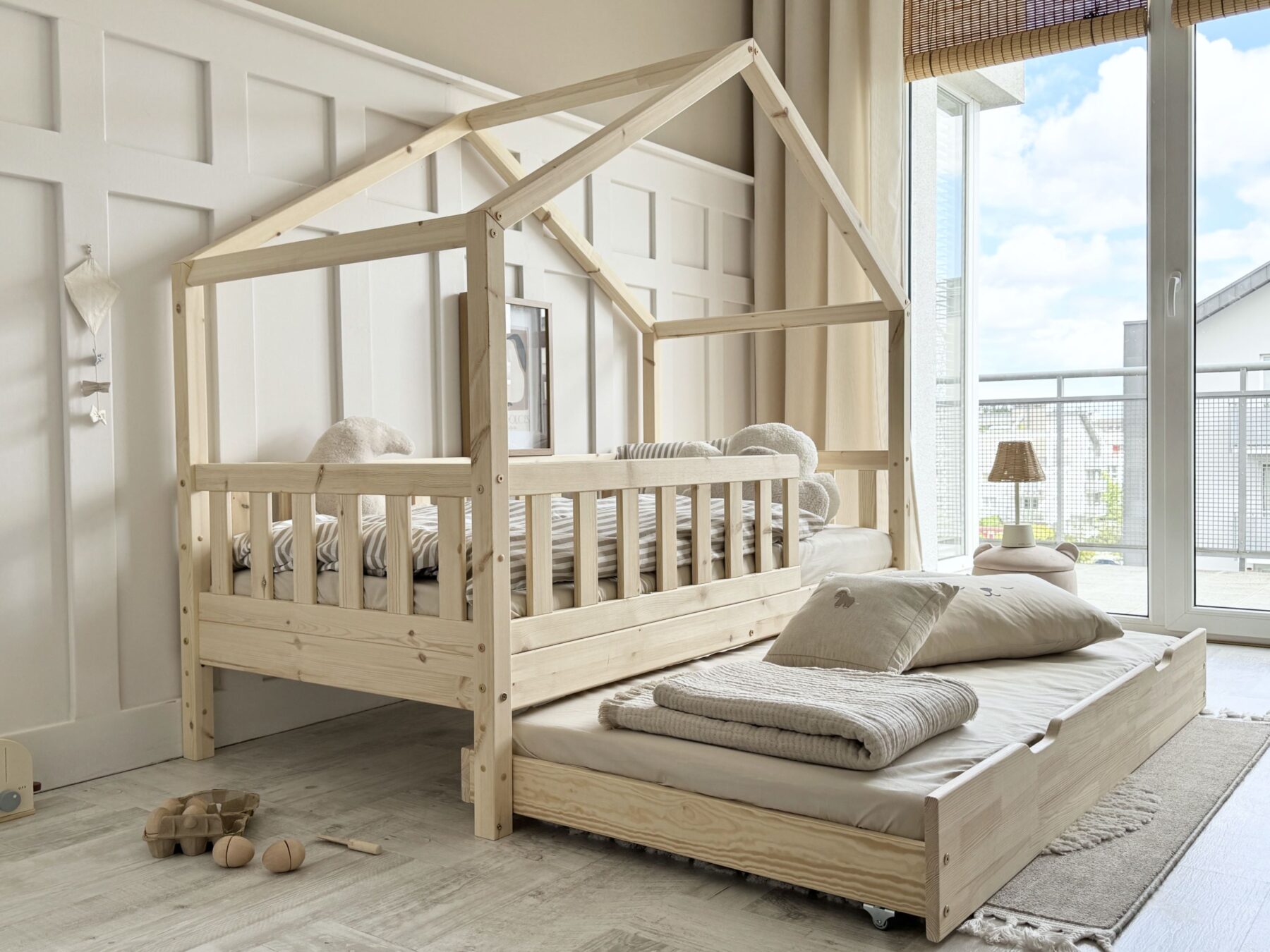 Das Kinderbett Hausbett GABBY PLUS von 90×190 cm bis 140×200 cm mit Gästebett ist ein einzigartiges Bett im skandinavischen Stil aus der PureWood-Kollektion, das speziell für Kinder und ihren komfortablen Schlaf entwickelt wurde.