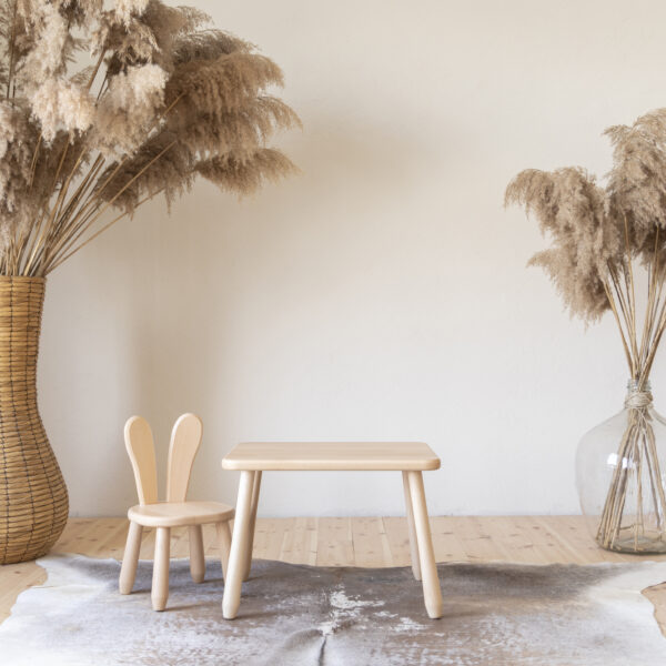 - Lieferumfang: 2x Kinderstuhl mit Hasenohren Motiv, 1x Kindertisch,