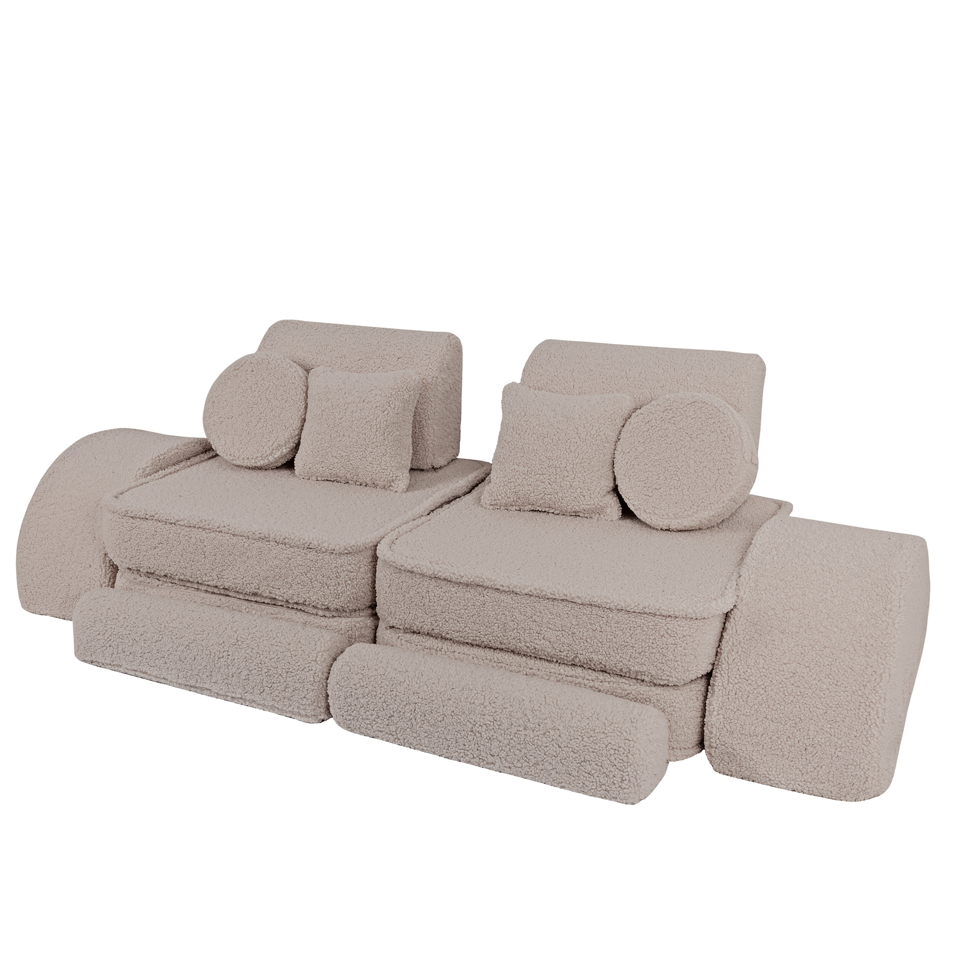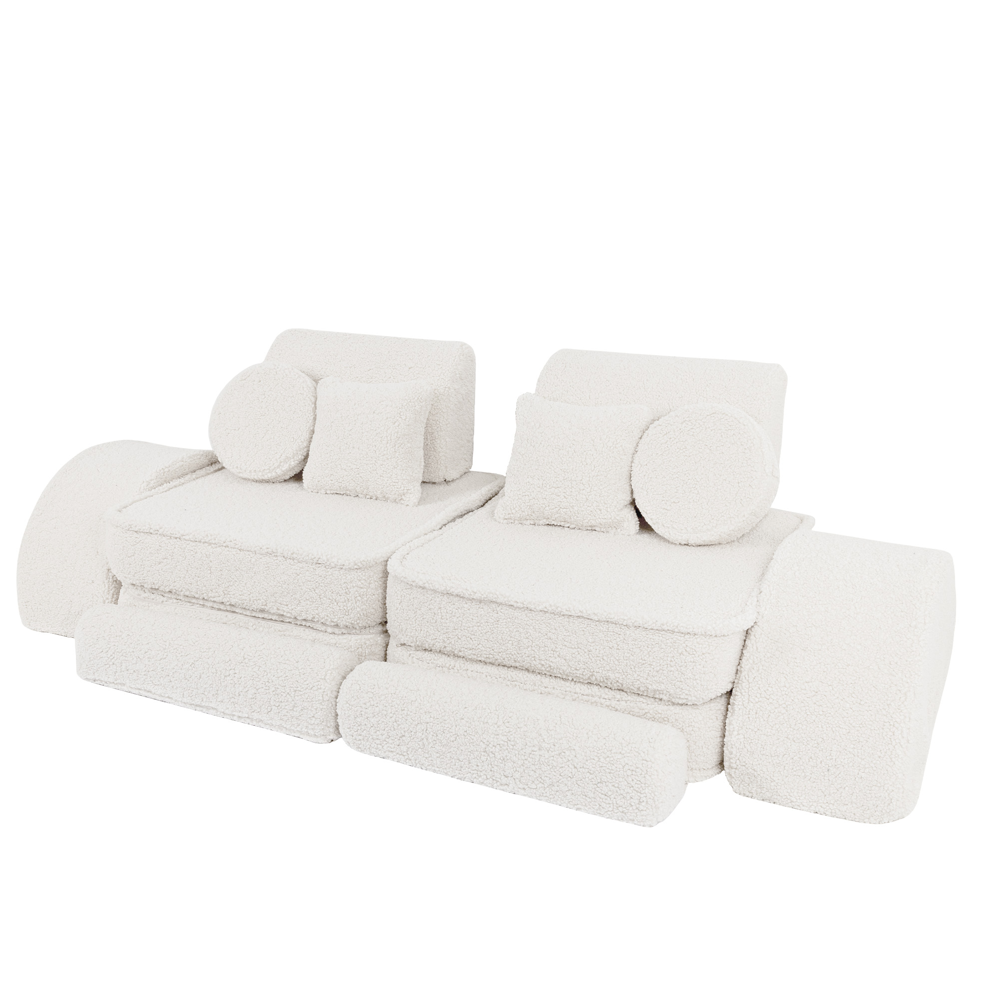 Ein Sofa, das mehr kann als nur Sitzen: das bietet die größte Variante unserer modularen Sofas und besteht aus 12 Elementen, die du immer wieder neu zusammenstellen kannst. Ob gemütliche Leseecke, abenteuerliche Spielburg oder spontaner Schlafplatz – hier entsteht im Handumdrehen genau der Raum, den dein Kind gerade braucht.