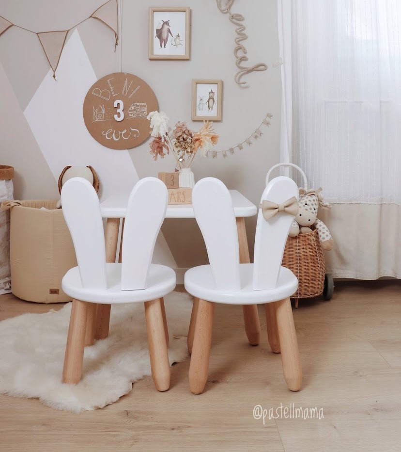 - Lieferumfang: 2x Kinderstuhl mit Hasenohren Motiv, 1x Kindertisch,