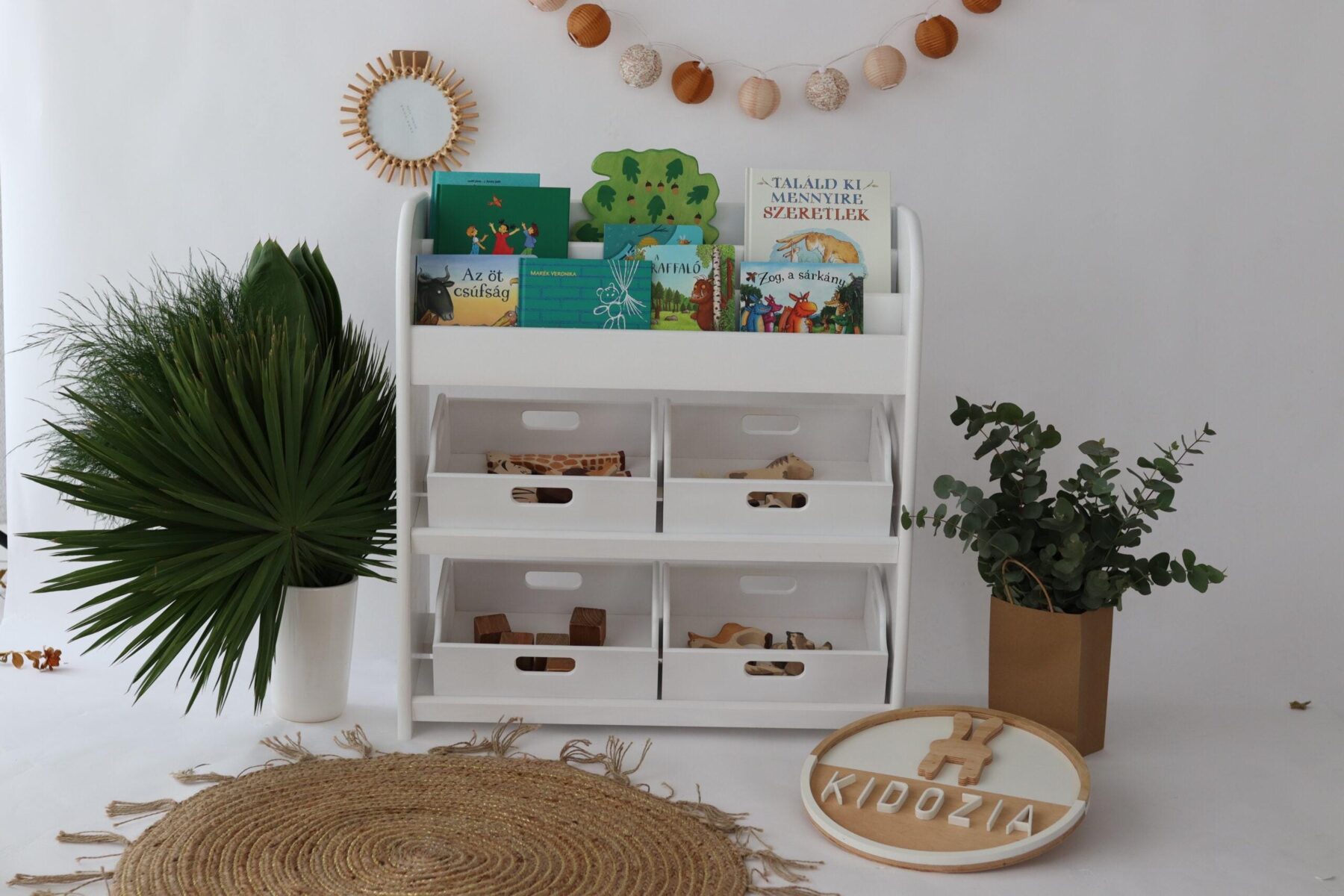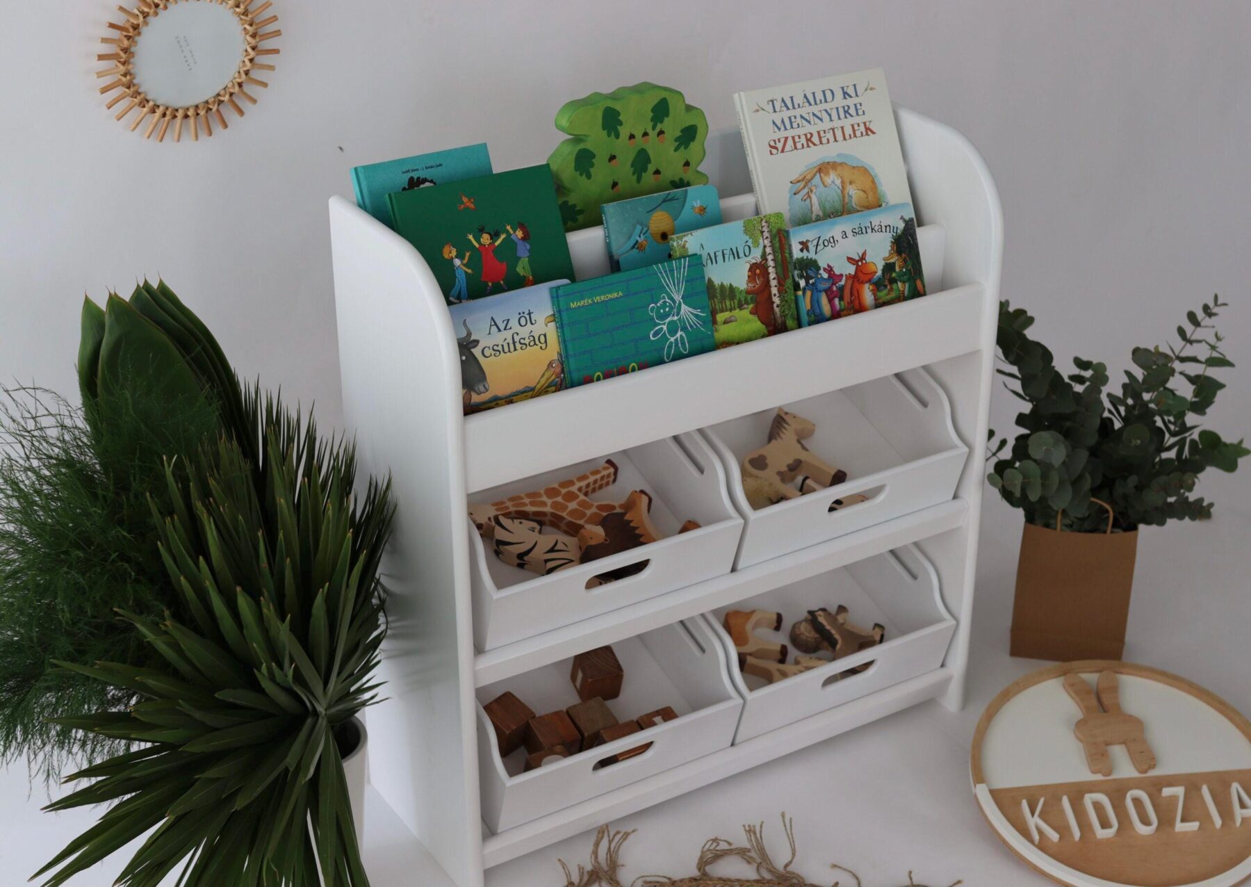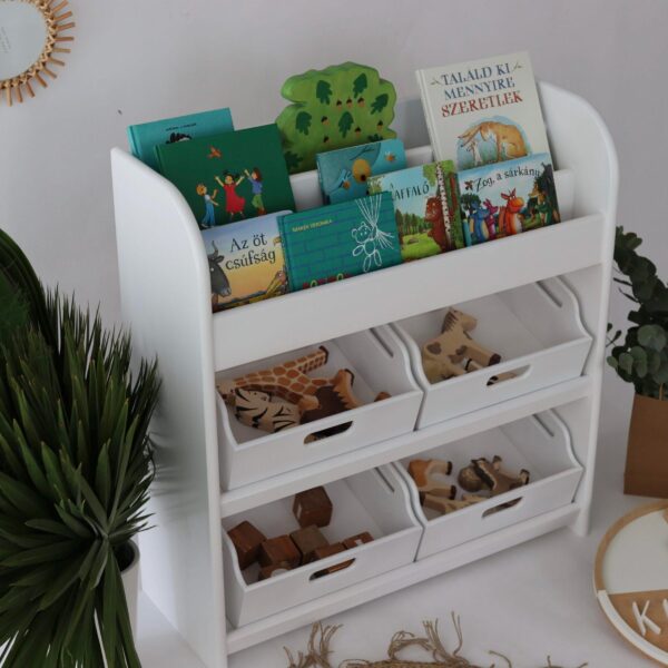 Dieses hochwertige Regal ist perfekt für Bücher, Spielsachen und Lieblingsstücke. Es bietet mit den zwei Truhen und auf drei Fächern genügend Platz, damit Kinder selbstständig Ordnung halten können.