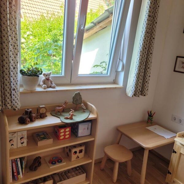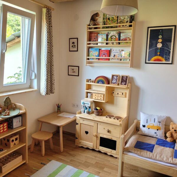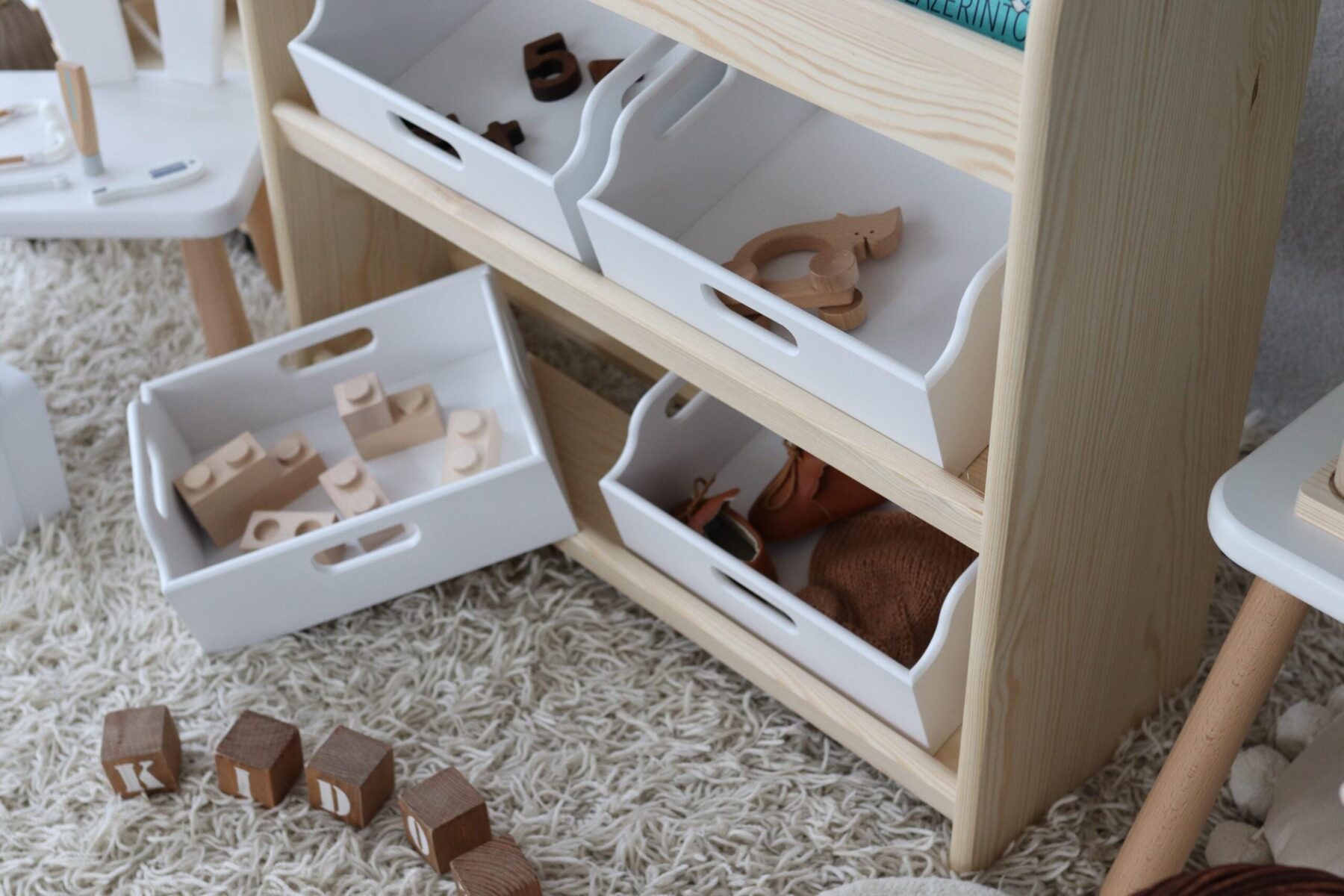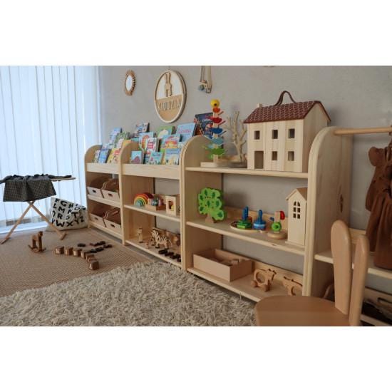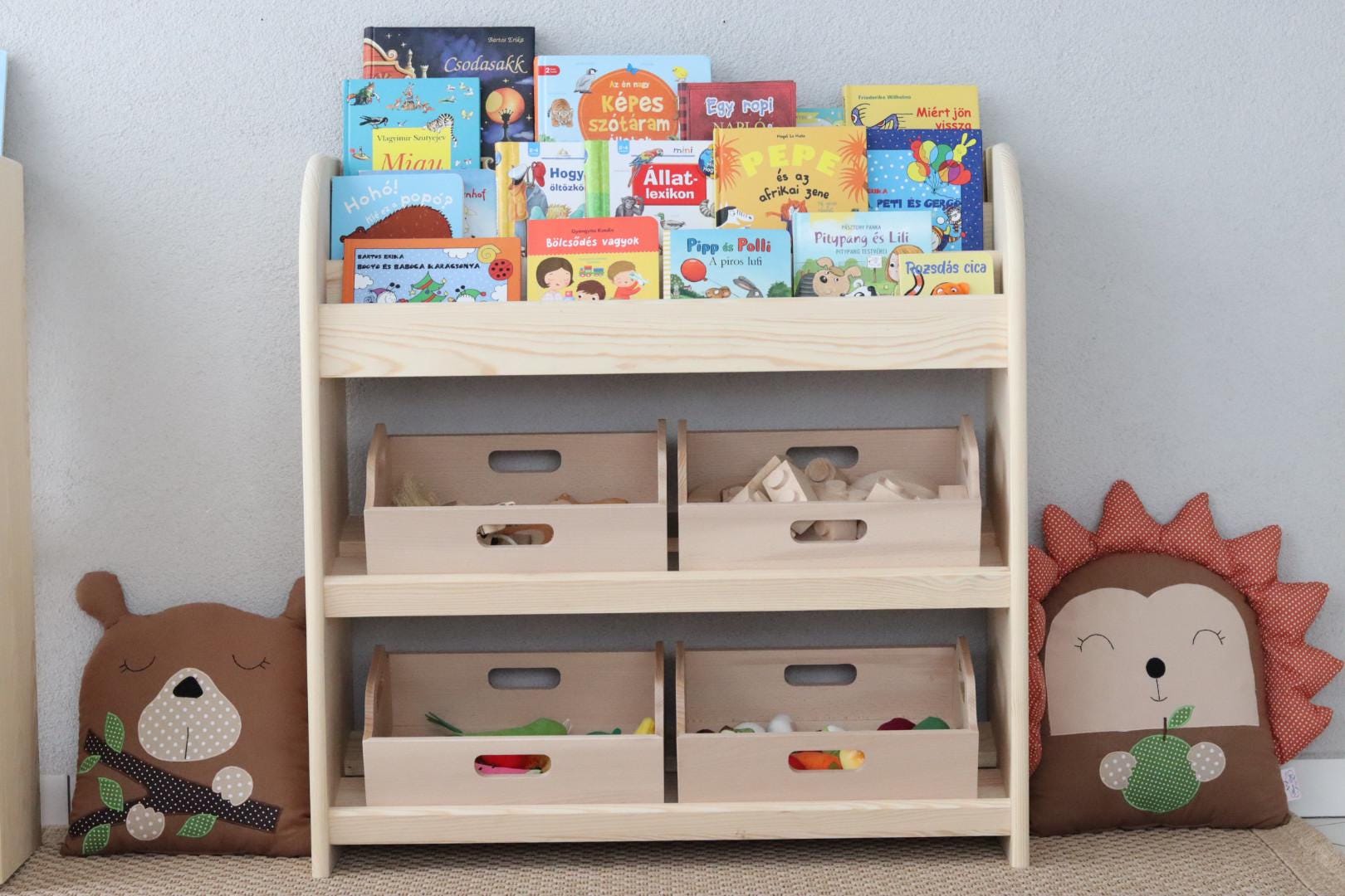 Montessori-Kinderregal aus massivem Kiefernholz mit 4 Truhen– natürlich schön und praktisch zugleich.