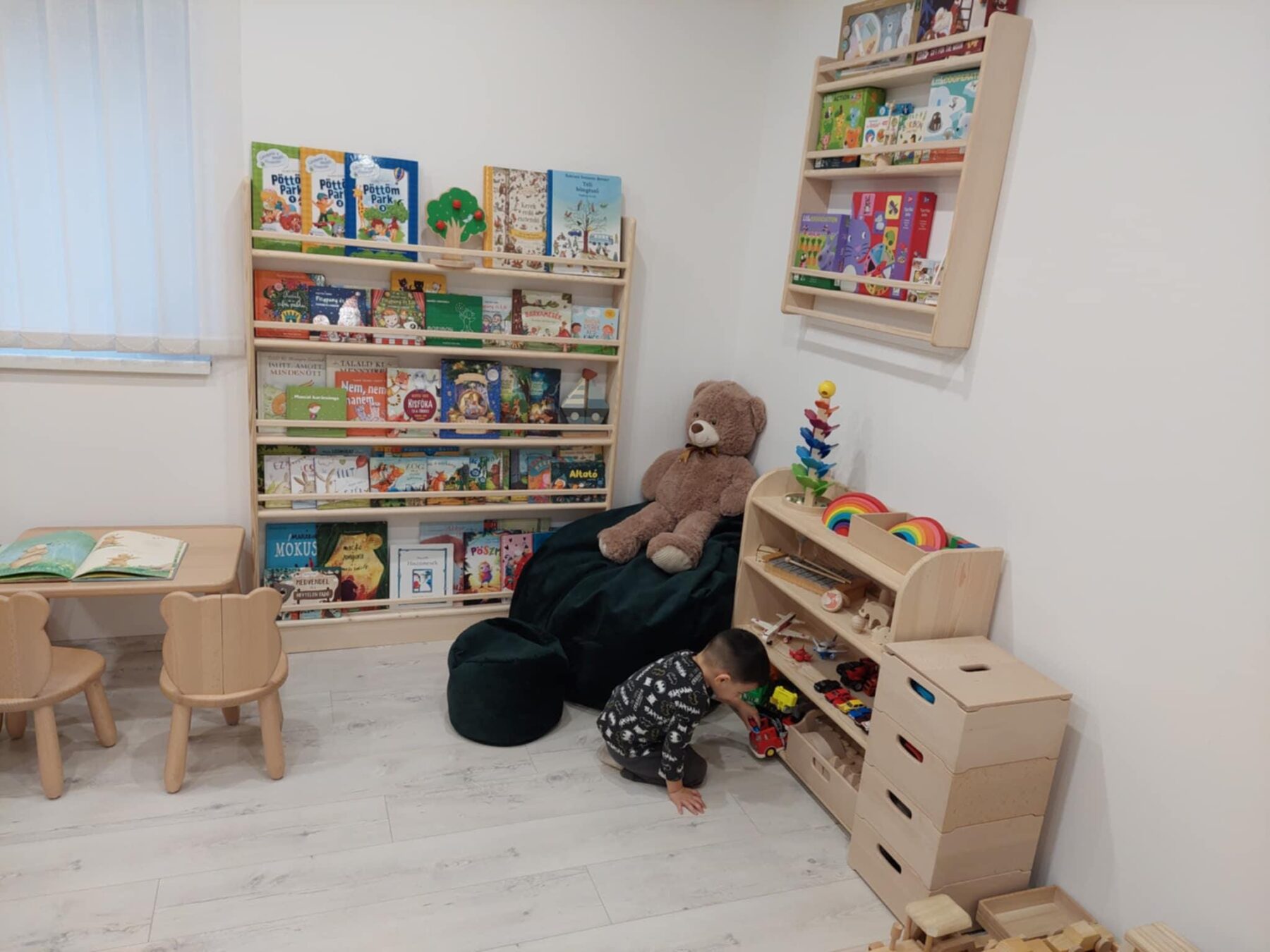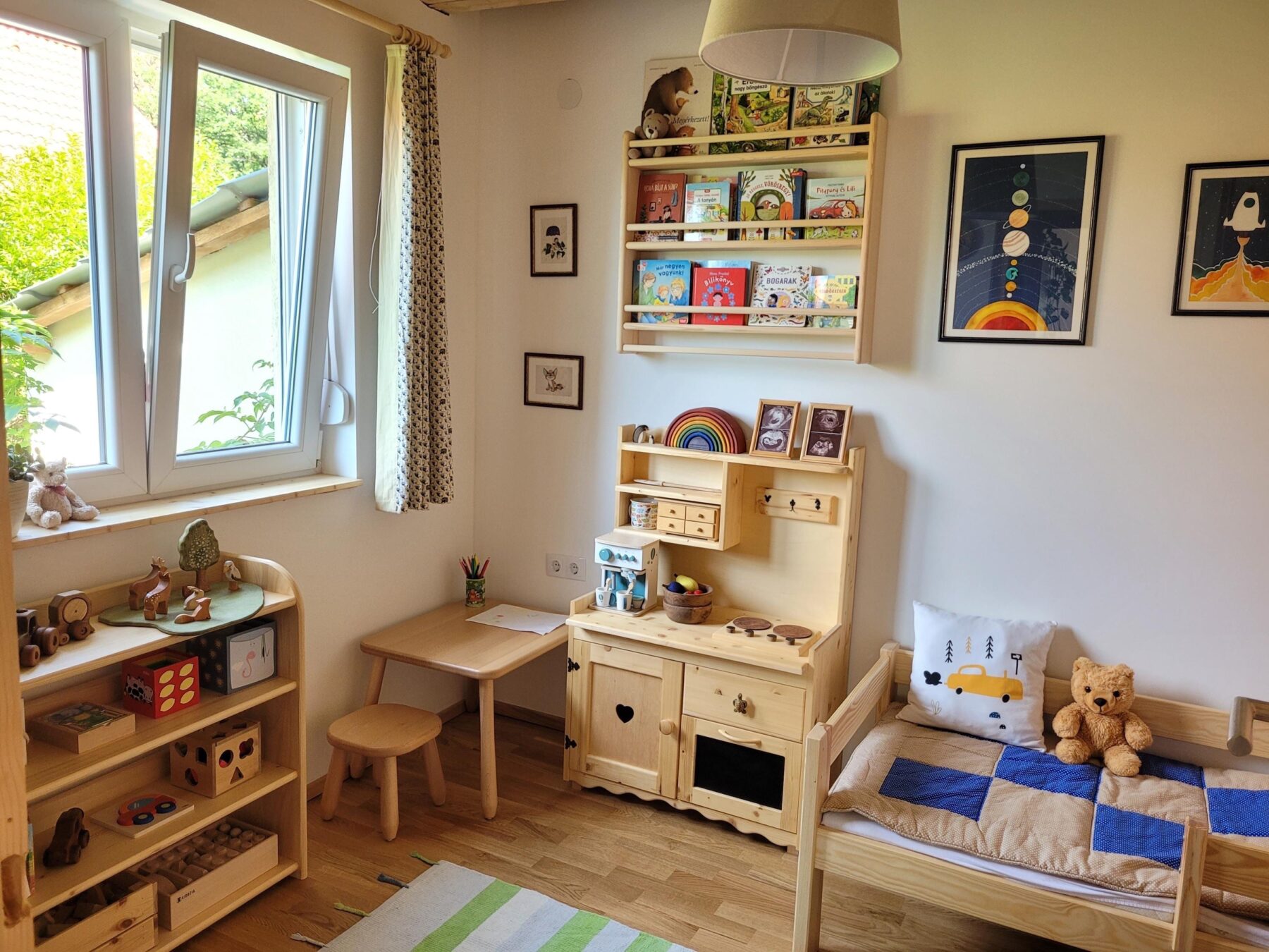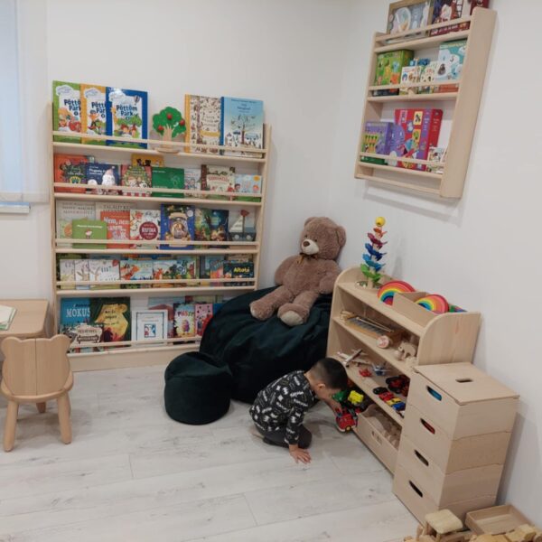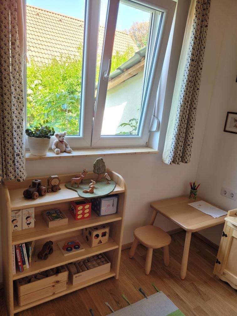 Montessori-Kinderregal aus massivem Kiefernholz mit 4 Truhen– natürlich schön und praktisch zugleich.