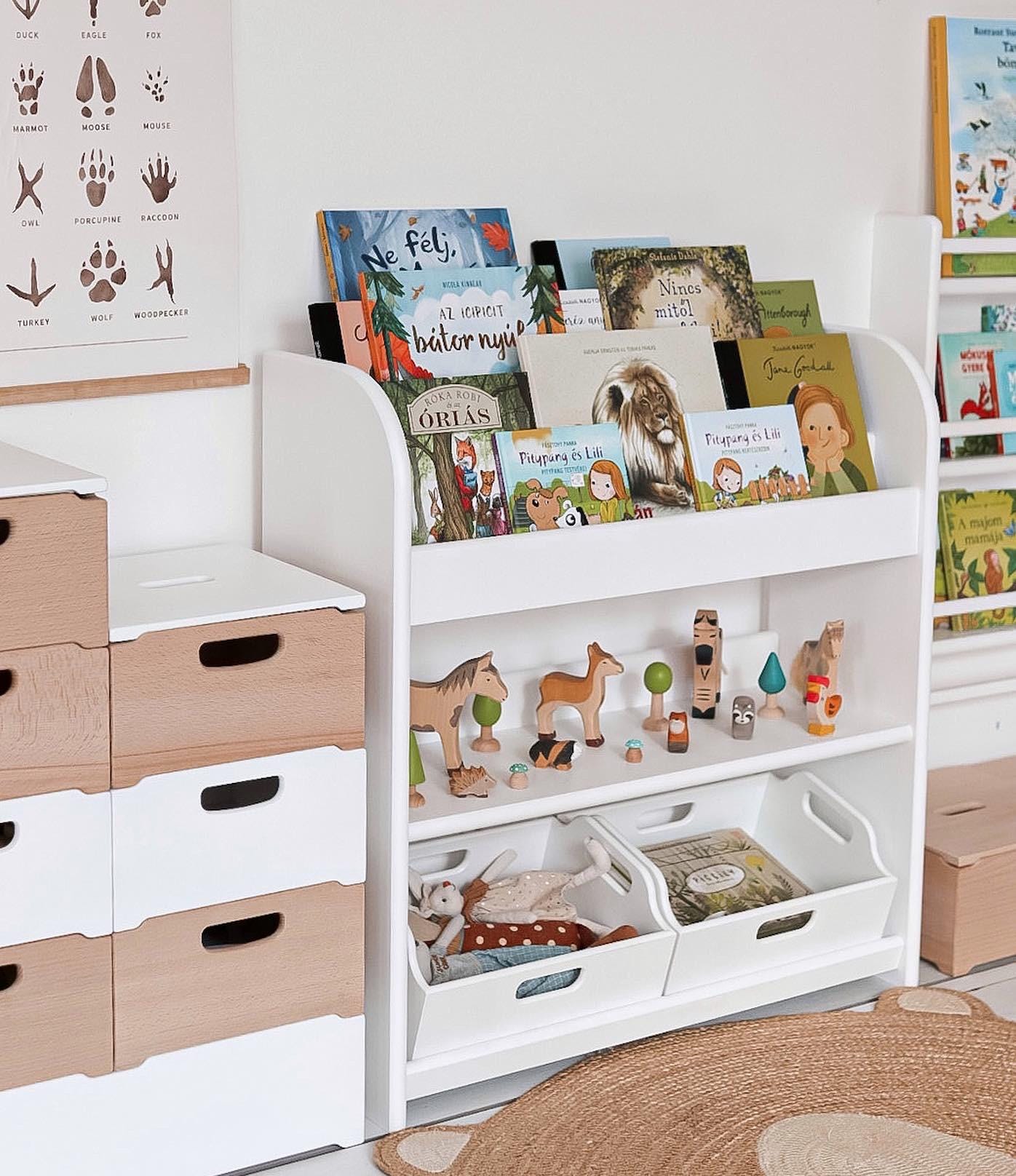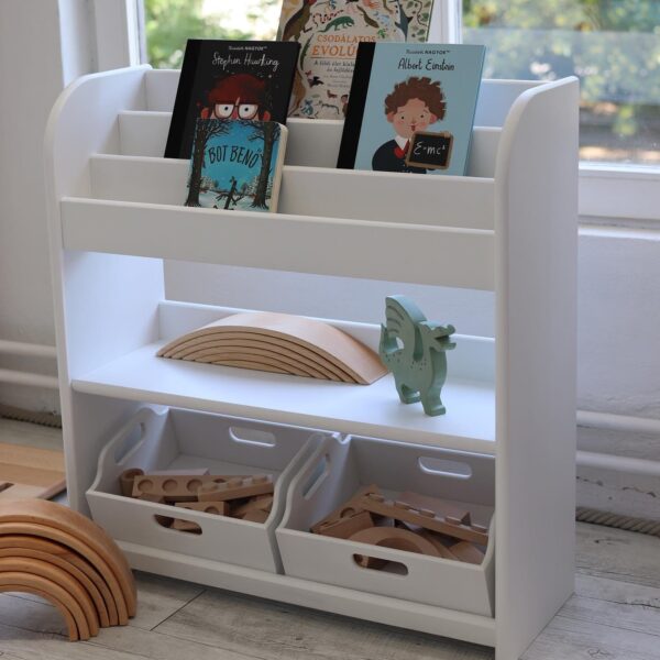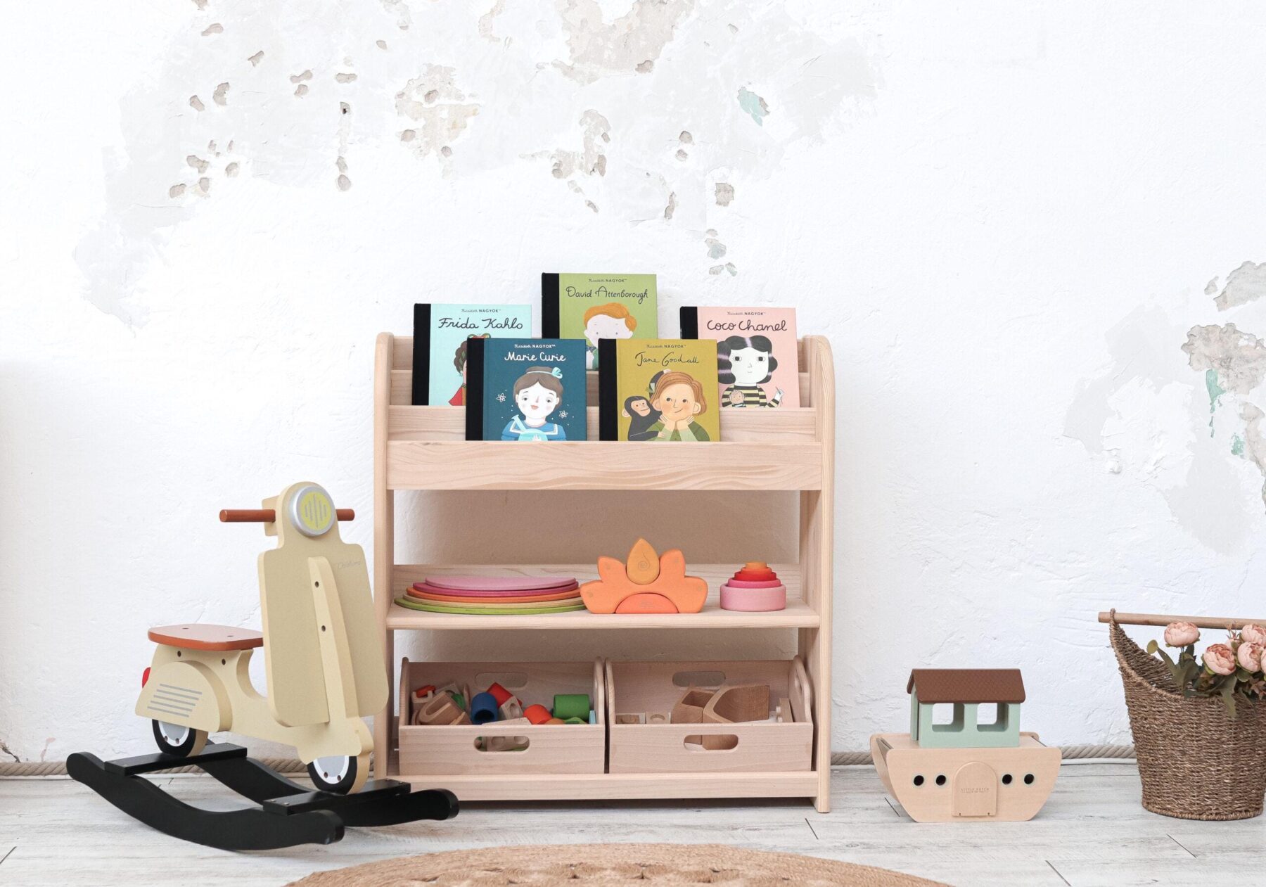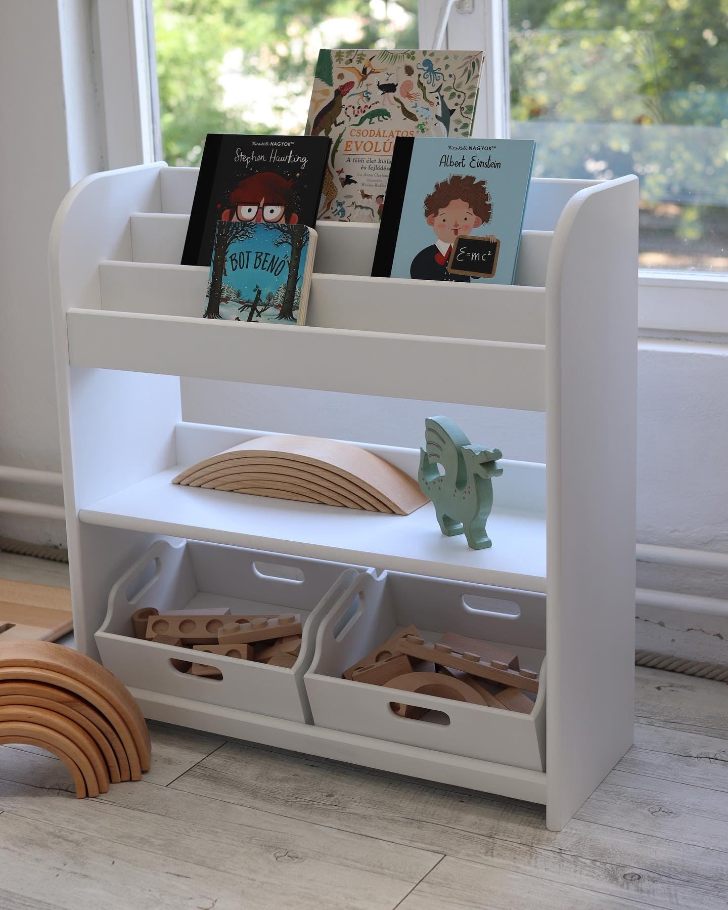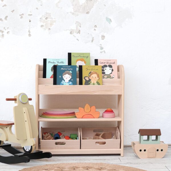 Dieses hochwertige Regal ist perfekt für Bücher, Spielsachen und Lieblingsstücke. Es bietet mit den zwei Truhen und auf drei Fächern genügend Platz, damit Kinder selbstständig Ordnung halten können.