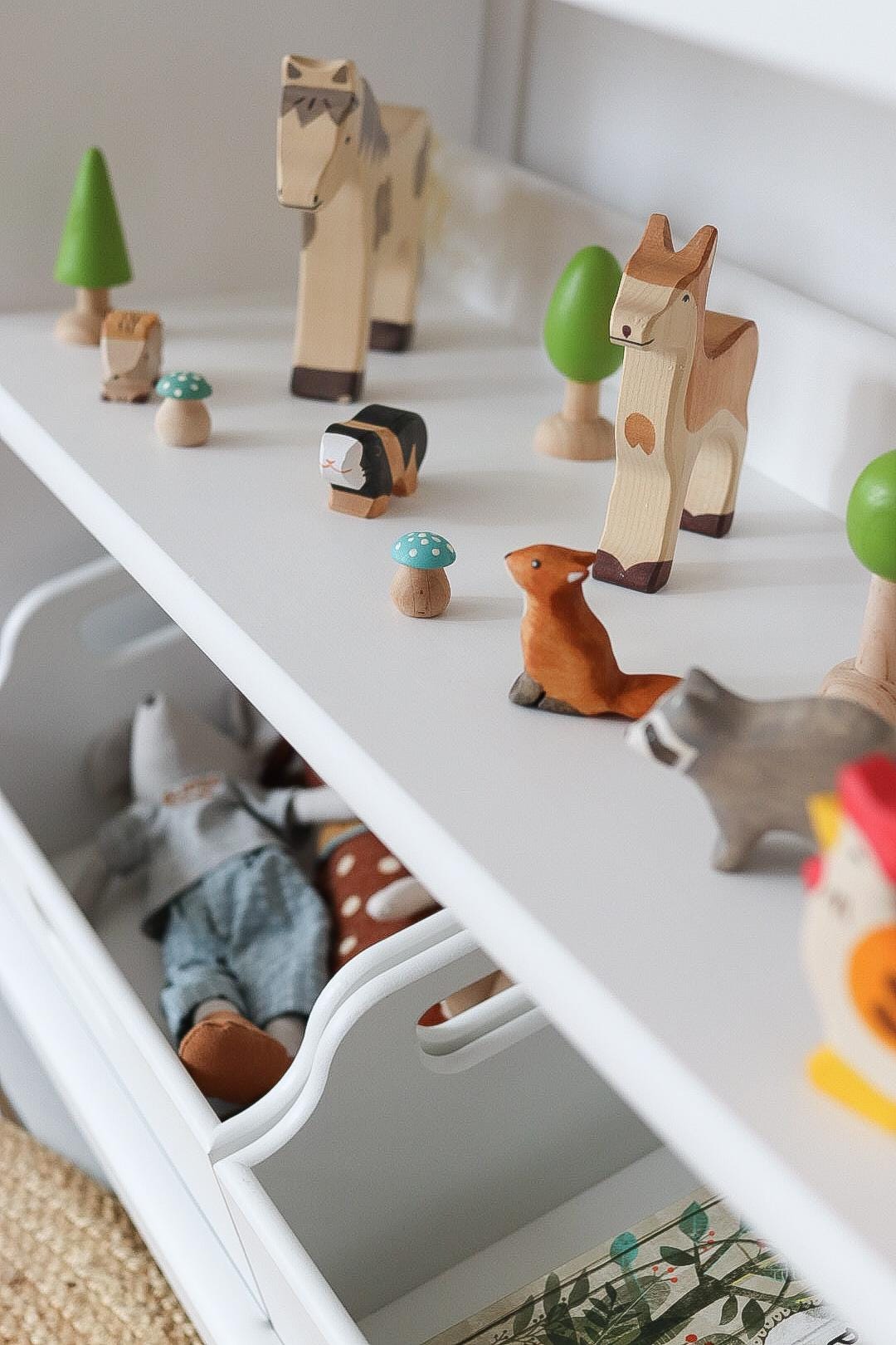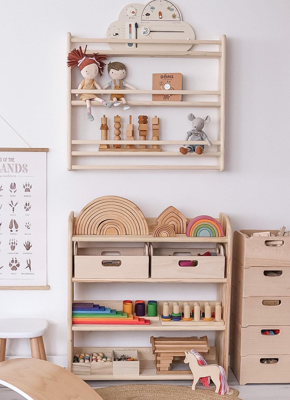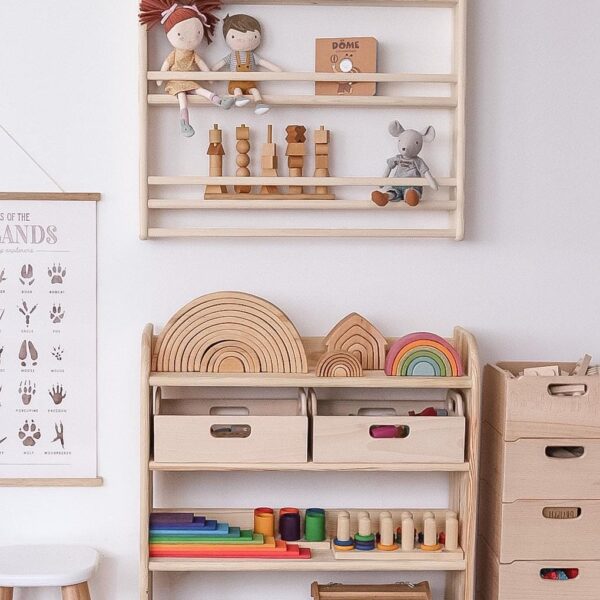 Montessori-Kinderregal aus massivem Kiefernholz mit 2 Truhen– natürlich schön und praktisch zugleich.