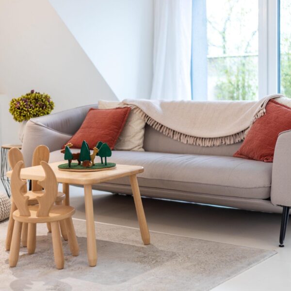 Das Set mit seinem stabilen Tisch und zwei kindgerechten Stühlen ist hochwertig, langlebig und ganz ohne scharfe Kanten. Die glatte Oberfläche ist fein geschliffen und mit kindersicherem Lack behandelt. Sorgfältig verarbeitet in einer familiengeführten Möbelmanufaktur.