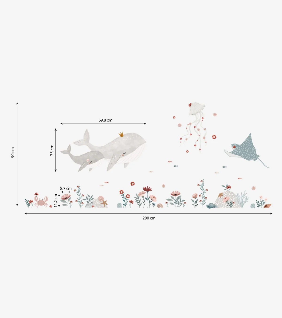Der Wandsticker “Ozean groß” ist ein Teil der “Ocean Field” Kollektion von Lilipinso. Diese Kollektion verwendet warme Farben und liebevolle Motive, um ein interessante Lebens für die Kids sichtbar zu machen. Auf dem A3-Bogen befindet sich die Welt der Ozeanen: Korallen, Muscheln, Schnecken, Seesterne, Blumen, Schildkröten, Seepferdchen, Krebse, Rochen und kleinere Fische, die deinem Kinderzimmer eine gemütliche Atmosphäre verleihen.