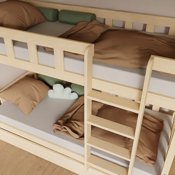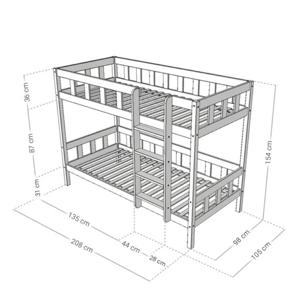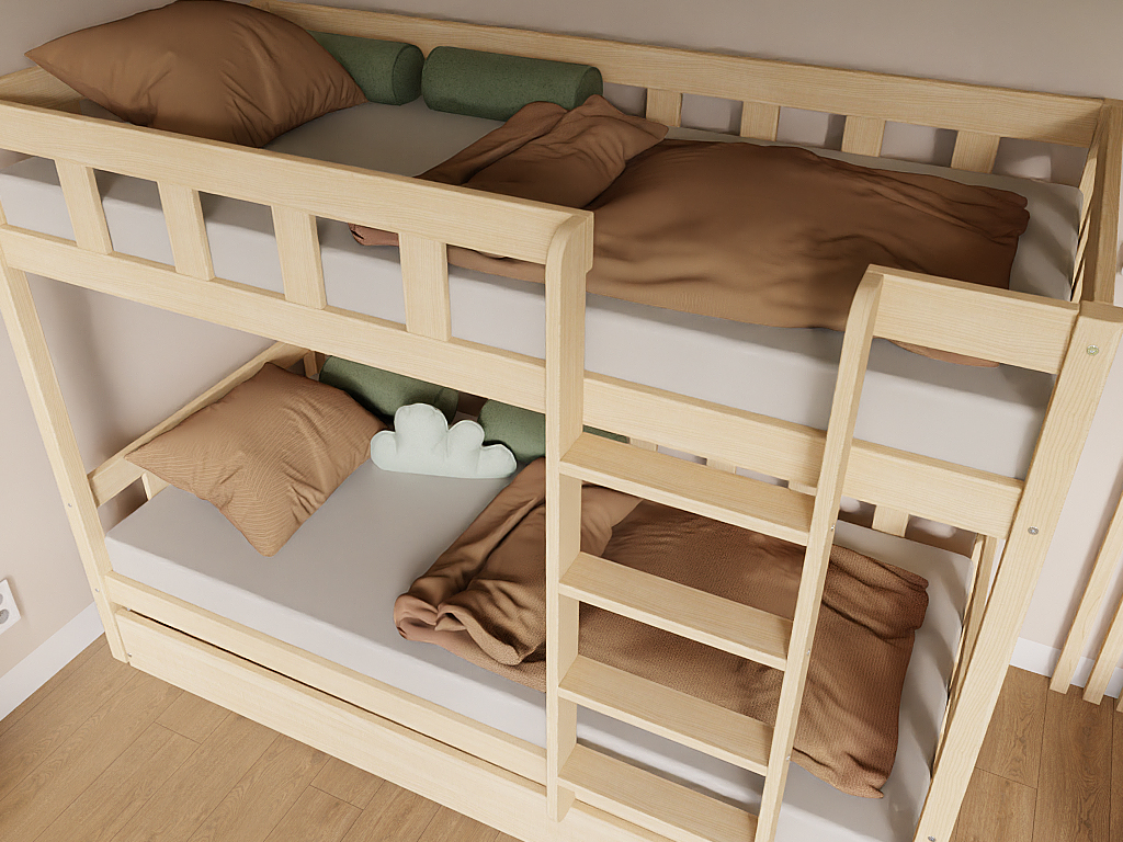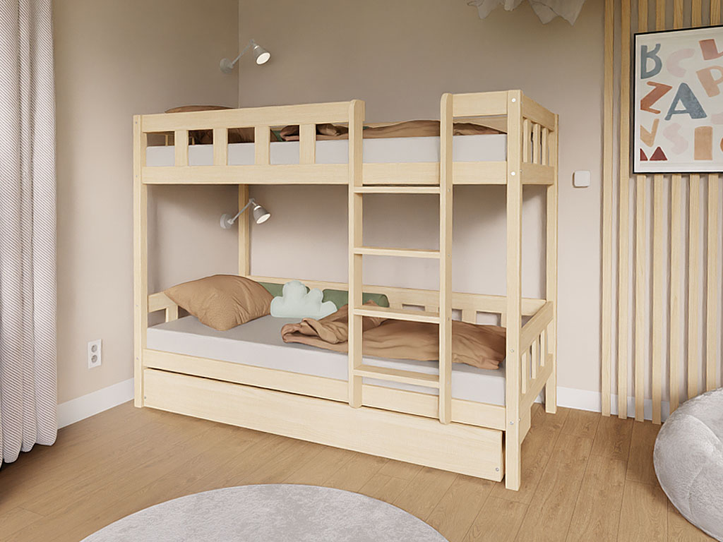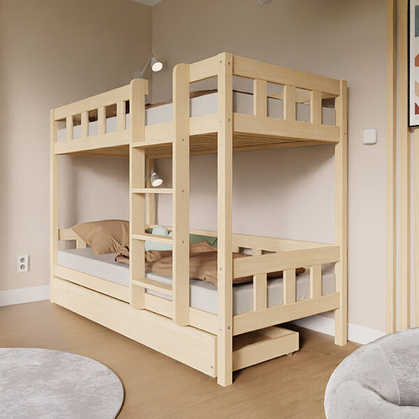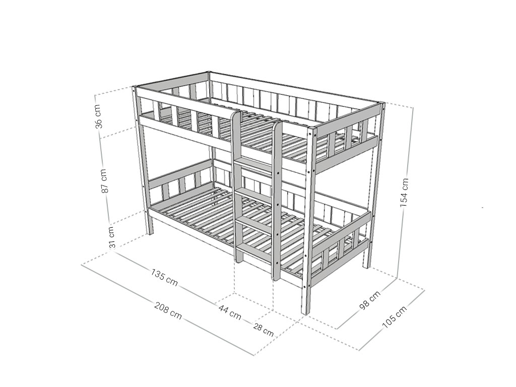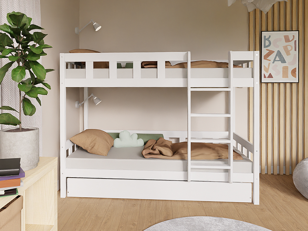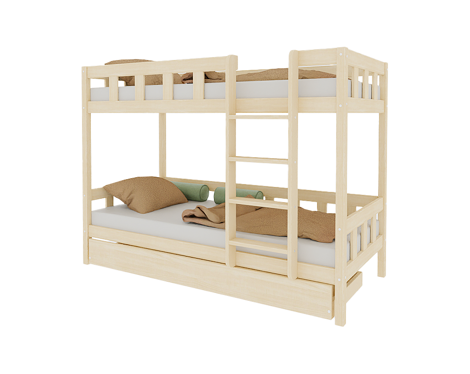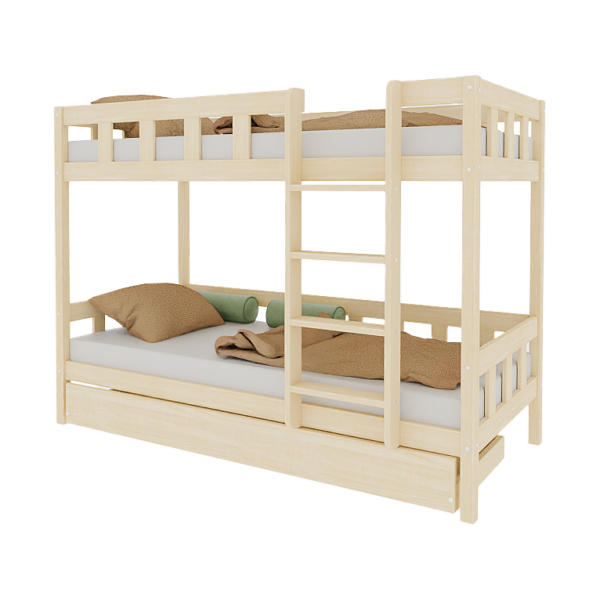 Spare wertvollen Platz im Kinderzimmer mit unserem hochwertigen Etagenbett PLOTTY. Der komplette Rahmen besteht aus massivem Kiefernholz und wurde speziell für Kinder entwickelt. Zudem lässt sich das Bett bei Bedarf zu zwei einzelnen Betten umbauen – ideal für wachsende Familien oder wechselnde Schlafsituationen.